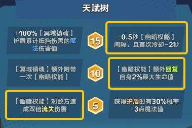 被动·幽暗权能:每4秒对自身造成10%当前生命值的流失伤害,且每1秒回复20%幽暗权能伤害并获得10层护盾,持续4秒。