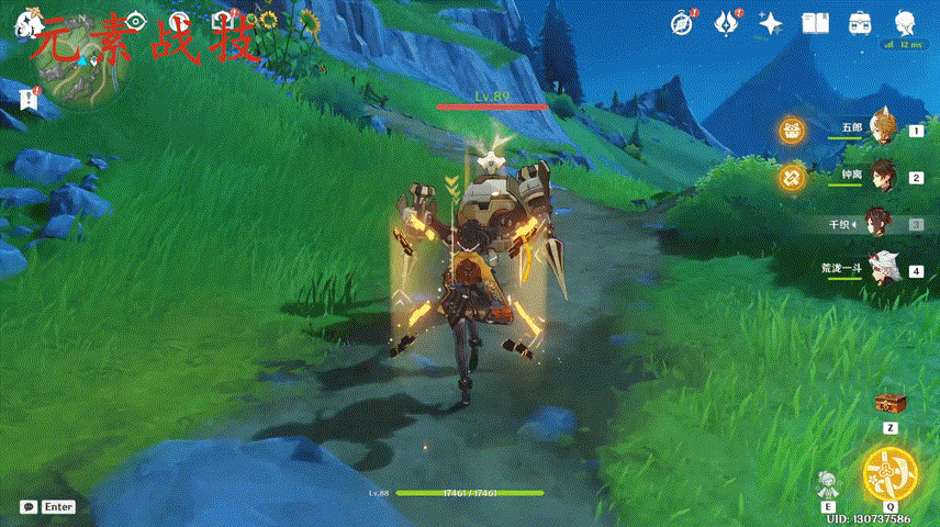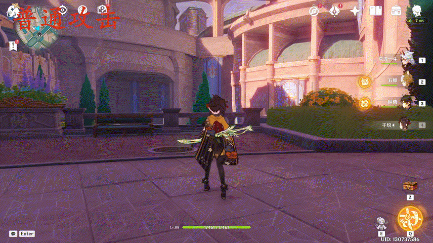 使用千织技能E之后,马上进行普通攻击,可以使千织的武器被岩元素附魔,从而普通攻击可以造成岩元素伤害。但对于生命值较低的千织来说,为了保护自身安全,不一定要使用普通攻击。