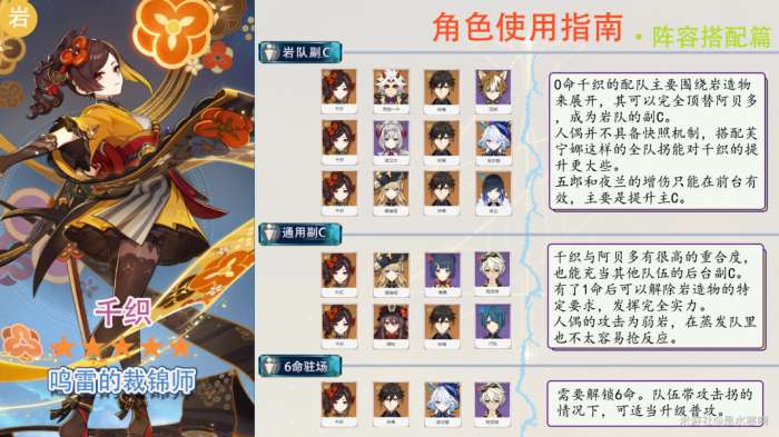 千织是一个出色的输出角色,尤其是在有命座加持的情况下,她在后台输出方面表现很好。虽然她本身没有强大的辅助能力,但她可以作为岩队的充电宝。如果你是喜欢岩系队伍的玩家,可以考虑抽取她。但是需要注意的是,由于岩系输出不太受待见,所以手头原石不充足的玩家需要三思而行。而且下期池子中的水龙王和万叶都是非常值得抽取或补充命座的角色,前者天花板输出高,后者增伤能力强。