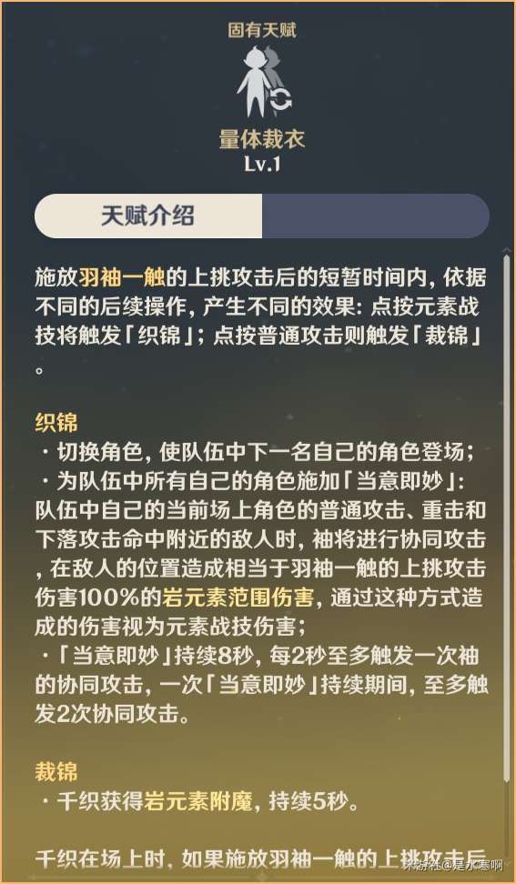 60级突破天赋则是千织伤害能力的再一次增强,配队合适就是很稳定的20%增伤加成了。这里条件倒是指明了是角色创造岩元素造物。
