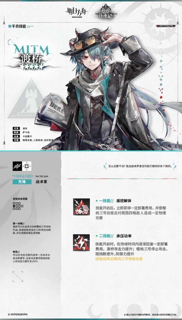 技能开启时,在持续时间内逐渐回复一定部署费用,渡桥攻击力提升;樱桃三号停止攻击,阻挡数提升,防御力提升