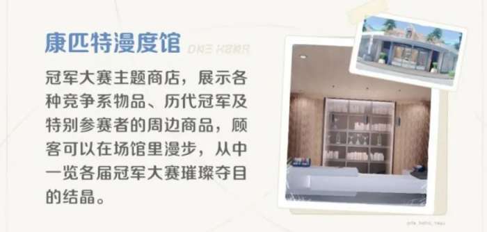 第五个建筑叫做康匹特漫度馆,这个会馆是非常奇特的一个建筑,在这个建筑里面,大家可以看到冠军大赛的一些主题商品,并且在其中还会展示各种竞争激列的物品,包括其中历代的冠军,还有一些特别的参赛者,他们的周边商品都会在这里上架,玩家可以在这个场馆里面看到很多相关的商品,而且从中还可以看到各界冠军里面比赛出来的片段,所以很多玩家在这里会度过很长的时间,当然这类商店里面也是有一些商品是大家可以购买的,就是价格比较昂贵。