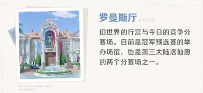 接下来是罗曼斯厅这个建筑,目前相对来说这个建筑是属于这个小镇里面比较豪华的一个建筑了,因为它是旧世界的行宫,所以在外观上面看起来是非常有贵族气息的,那么现在的话,它是竞争分赛场的一个入门,如果大家解锁了这个竞赛场的话,后期要去参与竞赛场参与战斗就可以从这里进入,目前的话这个地点也是冠军预选赛的举办场馆,所以大家如果参与了预选赛的话,参与赛事的话也需要来到这个罗曼斯厅里面,目前在洛仙恩大陆上只有两个分赛场,罗曼斯厅就是其中之一,所以很多玩家路过的时候一定要记得这个定位,不要忽略这个重要的建筑。