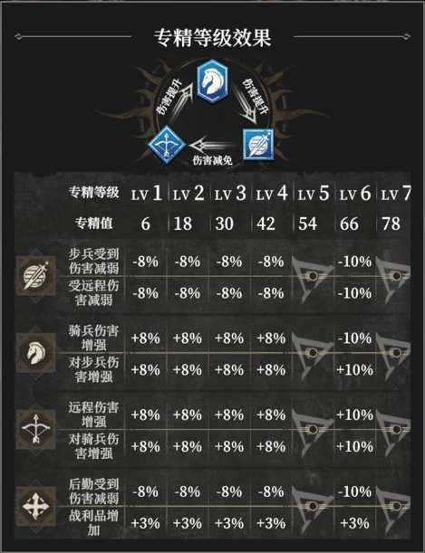 当某一专精达到5级和7级时将额外触发专精技能,每个兵种的专精技能都会有所不同。