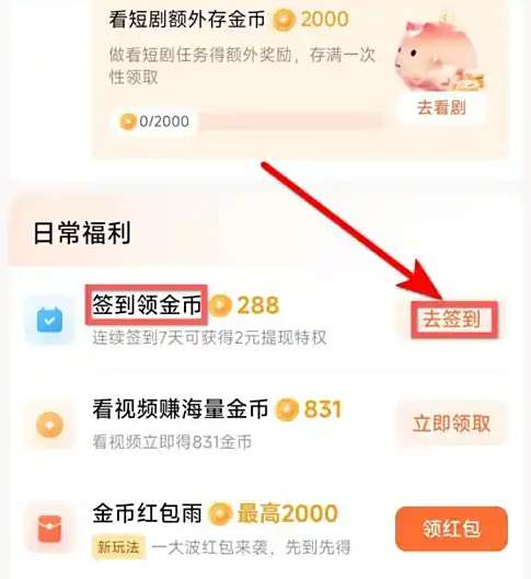 软件提交 专题合集 热门手游在红果免费短剧APP中,您可通过签到轻松获得金币:首先进入首页点击【福利】,随后在福利页面找到“签到领金币”并点击右侧【去签到】,最后在签到页面点击【立即签到】即可完成当日金币领取。