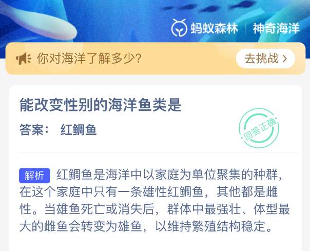 软件提交 专题合集 热门手游能改变性别的海洋鱼类是?【神奇海洋】2026年4月23日新题目已开答!正确答案现已公布,点击领取拼图,一起为修复海洋生态贡献力量!今日正确答案是:【红鲷鱼】。红鲷鱼中当雄鱼死亡或消失后,群体中最强壮、体型最大的雌鱼会转变为雄鱼,以维持繁殖结构稳定。