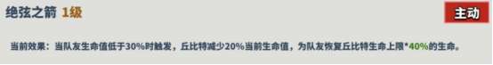 描述:当队友生命值低于30%时触发,丘比特减少20%当前生命值,为队友恢复丘比特生命上限*40%的生命。