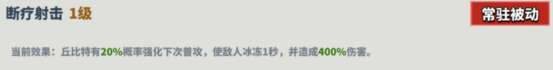 描述:丘比特有20%概率强化下次普攻,使敌人冰冻1秒,并造成400%伤害。