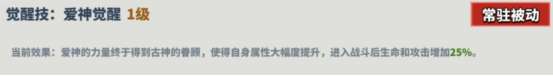 描述:爱神的力量终于得到古神的眷顾,使得自身属性大幅度提升,进入战斗后生命和攻击增加25%。