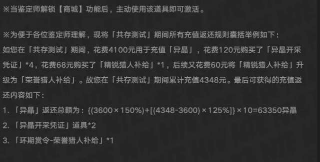 先说充值异晶的返还。测试期间充钱买异晶,公测后会按1块钱等于10个异晶来算。充值金额在3600块以内的部分,返还150%的异晶。超过3600块的那部分,返还125%的异晶。假如你充了5000块,那前3600块能拿回54000异晶,剩下1400块能拿回17500异晶,加起来就是71500异晶。这个返还比例算是相当不错了。