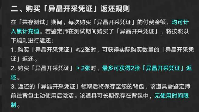 通行证的返还规则稍微有点复杂。游戏里叫异晶开采凭证,其实就是其他游戏的战令或者通行证。测试期间买这个凭证的钱,首先会按照上面说的异晶返还规则给你返异晶。除此之外,买凭证本身还有额外的返还。如果你买的凭证数量不超过2张,公测后会按实际购买数量返还凭证。要是买了超过2张,最多只返2张。返还的凭证会以道具形式发到背包里,需要自己去背包手动使用才能激活,而且这个道具没有使用期限,什么时候用都行。