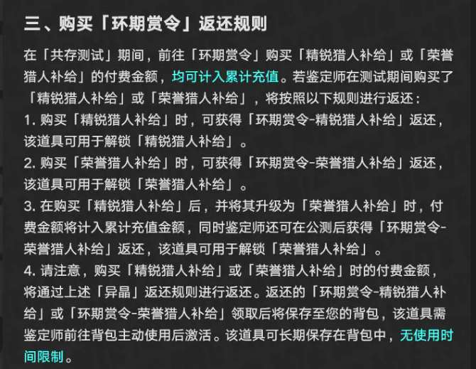 环期赏令也就是战令系统,分精锐猎人补给和荣誉猎人补给两种。测试期间买了哪种,公测后就会返还对应的解锁道具。买精锐的返精锐解锁道具,买荣誉的返荣誉解锁道具。如果你先买了精锐版,后来又升级成荣誉版,那公测后会直接给你荣誉版的解锁道具。同样的,买战令的钱也会按异晶返还规则再给你一遍异晶,返还的战令道具也是放在背包里需要自己激活。