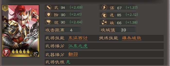 自带技能“东征西讨”是核心亮点:50%概率对敌军单体发动2次独立判定的兵刃攻击,完美契合“东征西讨”的突击爆发特性,是吴国阵容里的“双段伤害收割机”。