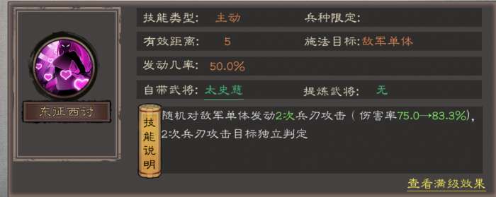 • 效果:对敌军单体连砍2次(伤害率75.0→83.3%),双段独立判定能稳定打高爆发,是太史慈的核心输出手段。