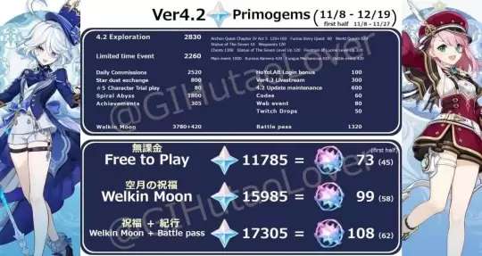 然后就是关于4.2卡池可以攒多少抽卡资源的汇总。不同类型的玩家(0氪金、小月卡、大月卡),攒到的奖励数量会有所不同。零氪金玩家可以获得大约73抽的奖励,而小月卡玩家可以获得99抽,大月卡玩家可以获得108抽的奖励。总体来看,所获得的资源还是比较少的。