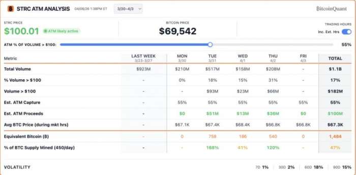 当STRC价格维持在或高于100美元面值附近时,Strategy便能够持续发行股票并用所得资金购买比特币。