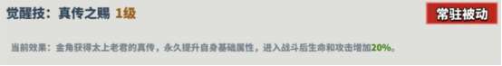 描述:金角获得太上老君的真传,永久提升自身基础属性,进入战斗后生命和攻击增加20%。