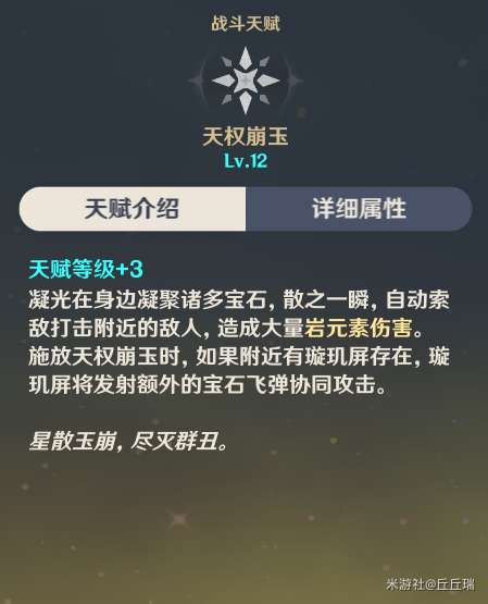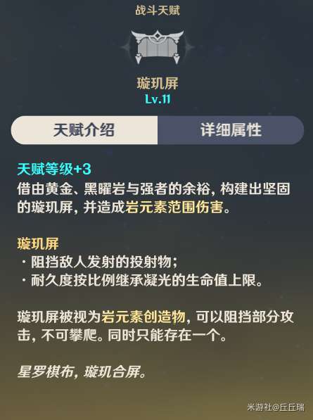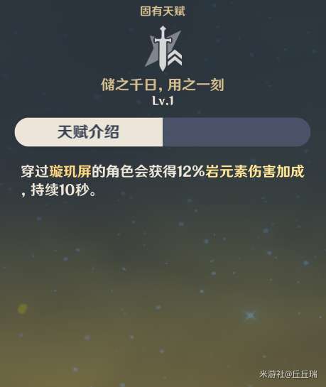 该天赋为增伤天赋,只要是穿过璇玑屏的角色都能获得这12%的岩元素伤害加成。这也给作战增加了一定的操作和乐趣,输出之前先穿屏。