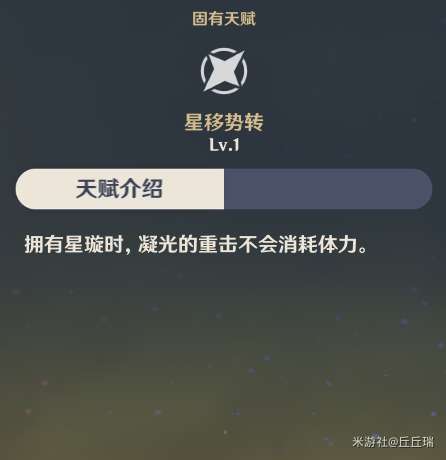 驻场凝光主要的输出手段。同样也是扔宝石,但是这颗宝石有点大。重击倍率在目前法器角色里排行第二位,倍率还不错,需要消耗50点较多的体力才能施放,但是在凝光角色等级突破20级后解锁的【固有天赋·星移势转】后,凝光拥有星璇时,重击将不会消耗体力。