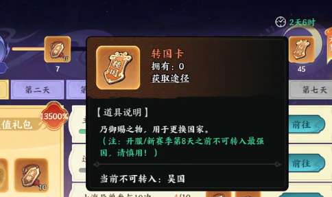 游戏开局阶段,玩家需从三大阵营中择一加入,此选择直接决定首周可招募武将池、主城建筑解锁序列及初期国家任务链。若后续出现阵营匹配度下降的情况,转国卡即成为唯一合规的跨阵营迁移凭证。它并非单纯的身份变更工具,更承担着降低试错损耗的作用——持有转国卡后,玩家可将已培养但原属他国的武将纳入新阵营体系,避免因初始选国失误导致稀有武将闲置、经验材料浪费或战力断层等问题。