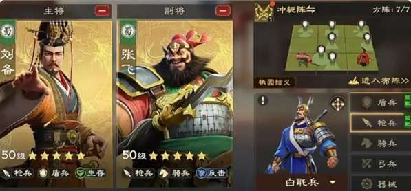 由刘备加张飞,搭配冲轭阵和白毦兵组成,通过持续反击,对所有普攻自己的部队造成伤害,野外前排肉盾,通过队伍的反击和回复,适合以少打多,是车头大佬,兵源充足,野战刷战功的不二之选。主要克制技能骑和控制骑,然后被普射攻克制,野战遇到尽量避其锋芒。天赋加点的话,选择增加反击率的和增加防御的天赋。