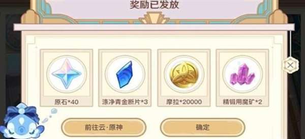 奖励就是原石*40、涤净青金断片*3、摩拉*20000、精锻用魔矿*2。