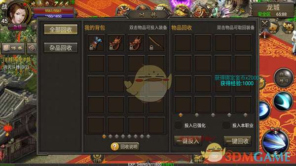 2、装备回收:低级装备可通过回收获得大量经验,每次击杀怪物掉落的装备(无论高低级)全部捡起,攒满背包后到龙城装备回收员处回收。