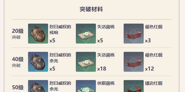 20级:烈日威权的残响5、失活菌核5、褪色红绸5;