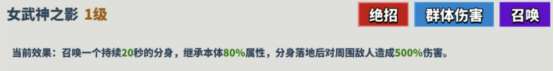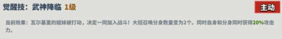 描述:瓦尔基里的姐妹被打动,决定一同加入战斗!大招召唤分身数量变为2个。同时自身和分身同时获得20%攻击力。