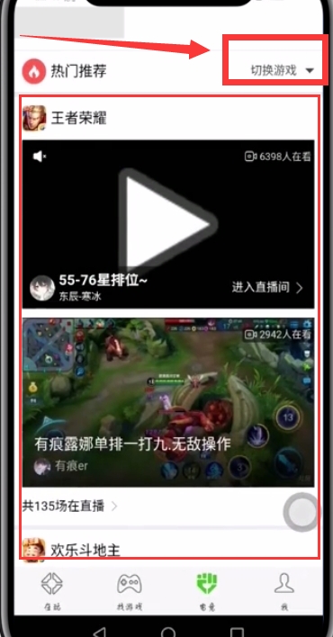3、可以点击选择自己喜欢的游戏直播,比如王者荣耀等。如果想要更多直播,则点击右上方的“切换游戏”,