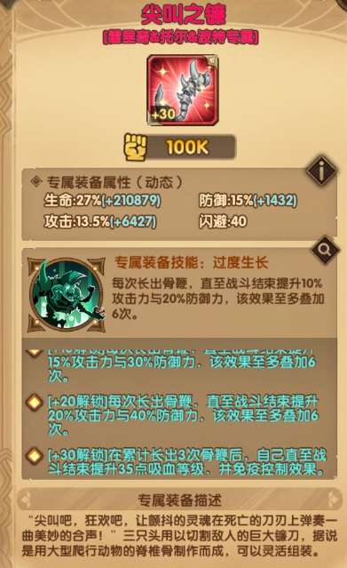 这就完了吗?没呢,专武才是绝世神技每次长出骨鞭,提升20%的攻击力和40%的防御力,叠加六层,六层,六层呀,看来女仆又要移情别恋了,专武30我都不想说了,这不是神吗?不是神吗?是神吗?神吗?吗??提升35点吸血等级咱不说有多好用,这个三次骨鞭后免疫控制效果,感觉这货能单挑一队了,不是么。