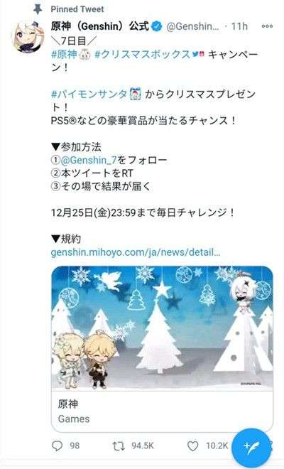 原神在全球多个国家和地区均已上线,而最近官推上也正在为迎接圣诞节而开启抽奖送PS5等好礼的福利活动。