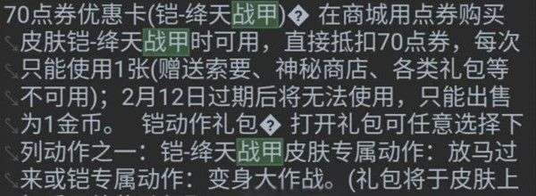 此皮肤的专属点券优惠卡已经曝光出来,时间是到2月12日过期,一般来说专属点券优惠卡有七天使用期限,也就是说2月5日这款皮肤就会上架了,也就是下周五,这种情况下本周就很可能会有铠皮肤的官宣消息。
