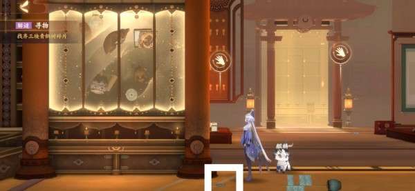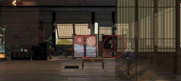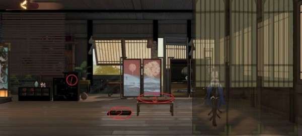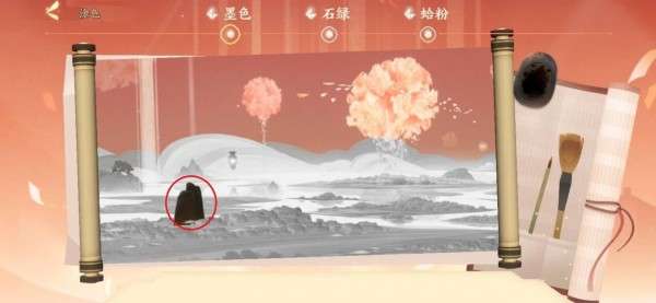 5.之后再去跟曹植互动,蘸取他面前的颜料后,他会叫我们帮忙修复中间和右边的屏风,修复的同时按照正常流程走,我们会获得3种可以制成颜料的素材石。(一开始获得的墨色只能画下图圈起来的两块位置)