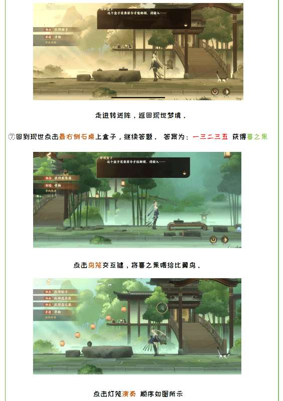 ⑥进入忘川,打开桌上的第二个盒子,一三二三五,获得喜之果。把喜之果喂给鸟,会唱第二首,顺序: 1-3-5-4-3-4-3-1获得商音和徵音琴弦,进入幻境,在嵇康面前的石块上获得琴弦,在拱桥左边的柱子那获得琴弦,在竹林获得最后一个琴弦。