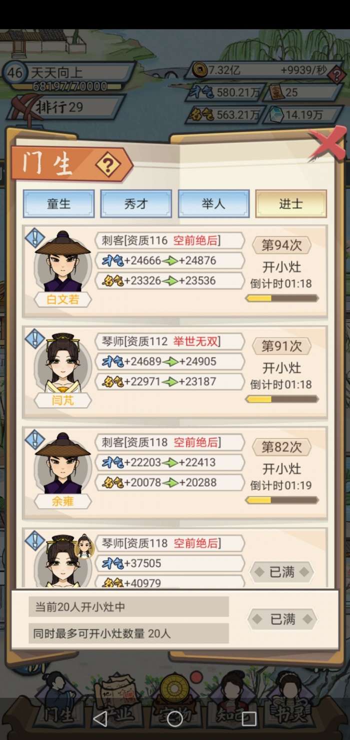 2,等级越高,门生品质越高。招生界面只留当前最高品质的,其他拒收,然后看广告刷新资质,直到绝无仅有,举世无双,空前绝后后招收。