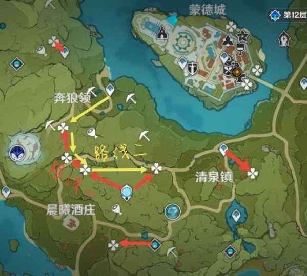 2.蒲公英籽采集路线下列图标中形状为“四叶草”的即为蒲公英籽固定刷新点,每72小时刷新一次。部分区域提供了两条路线(红、黄),旅行者们可以根据个人喜好进行选择