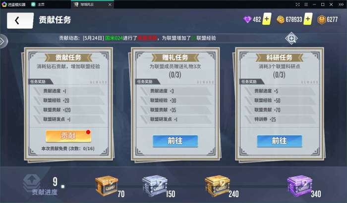 联盟任务每天三次送礼,自己获得联盟研发点,体力和联盟贡献。盟友获得特训券和联盟贡献。