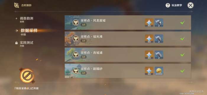 风龙废墟、瑶光滩、清墟浦、踏鞴砂四个采样点每个光钉会引来两波怪物,保持充能在第二个光腚第二波怪物时就可以全部充能完毕,重点保护第一个光钉即可。龙脊雪山和孤云阁采样点怪物出现频率高,数量多,出现时间固定(第一波打不死会直接换第二波),保护过程保持充能即可,无需慌张。