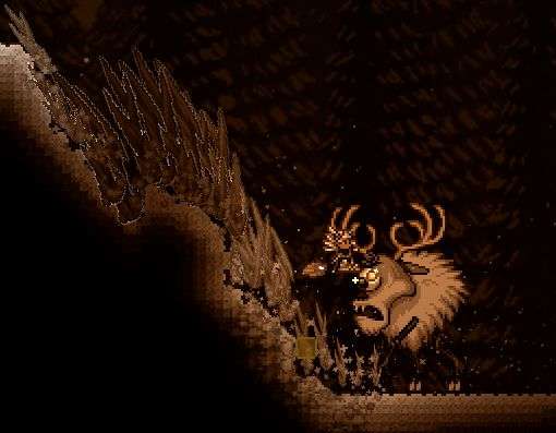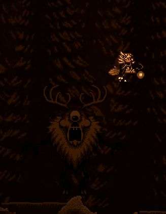 冰雪践踏:当玩家站到其脸上时,鹿角怪会奋力踏向地面溅起一阵冲击波,并在冲击波经过的物块上弹出冰雪尖刺对玩家造成伤害;