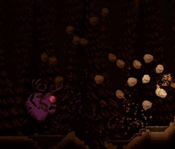 利用这一点,我们只要看到鹿角怪侧身手抬起/放下时,直接就可以利用二段跳反着跳出攻击范围躲避。反复如此,在迷你鲨的火力下即使是一万五千血的庞然大物,也终究不堪地倒下。