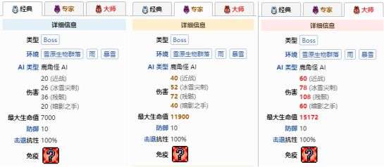 无论是伤害还是生命值,鹿角怪都有着明显不属于这个时期的强大实力。并且鹿角怪拥有一个玩家远离一段距离后进入无敌的无赖机制,导致我们几乎很难将其风筝死。对于第一次接触这个Boss的冒险者来说,致命的暗影手以及伤害高弹幕密集的雪球攻击都是非常致命的。