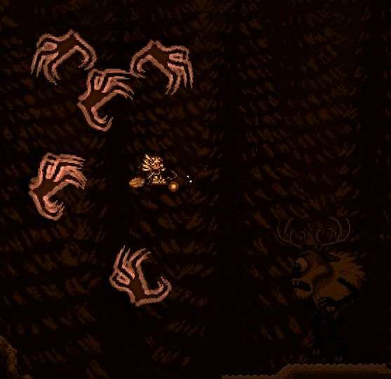 暗影之手:当玩家距离鹿角怪过远时,鹿角怪会仰天大吼并召唤数只暗影之手袭向玩家(虽然看似手很多但其实比较好躲,并且因为无敌帧机制你一般最多只会吃到一下);