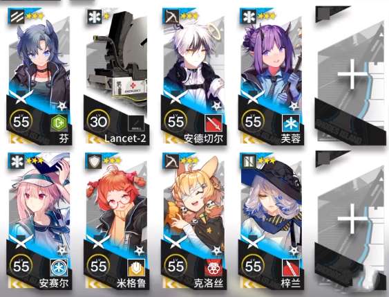 需求干员:梓兰(减速辅助)、克洛丝(单狙)、安德切尔(单狙)、芙蓉(单奶)、安赛尔(单奶)、米格鲁(重装)、芬(挡2先锋)