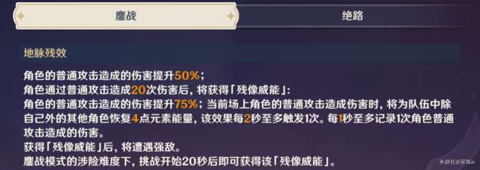 2.最好先将队伍内4名角色的大招满充能之后再开启挑战,但是不要上来直接放大招,第一件事就是普攻角色战场输出,触发残像威能出现强敌之后再切换其他角色放大招加成或者辅助伤害