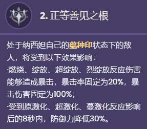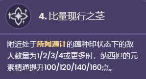 附近处于所闻遍计的蕴种印状态下的敌人数量为1/2/3/4或更多时,纳西妲的元素精通提升100/120/140/160点。