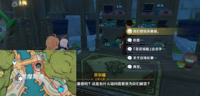 4、去到奥摩斯港图中位置,找到NPC[贝尔福]并对话,选择培养蕈兽。