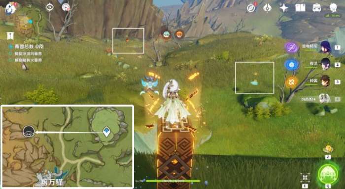 3、首先去往喀万驿右上角传送锚点,到对应位置捕捉到风蕈兽和火蕈兽。