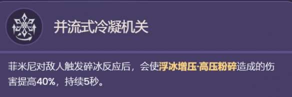 菲米尼对敌人触发碎冰反应后,会使浮冰增压·高压粉碎造成的伤害提高40%,持续5秒。