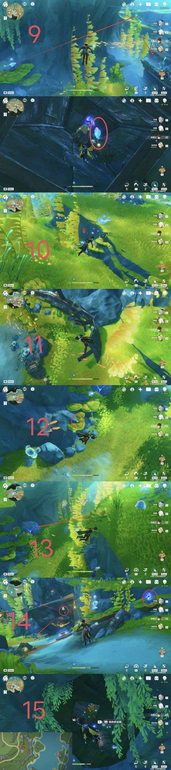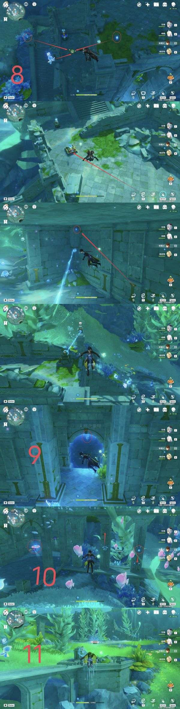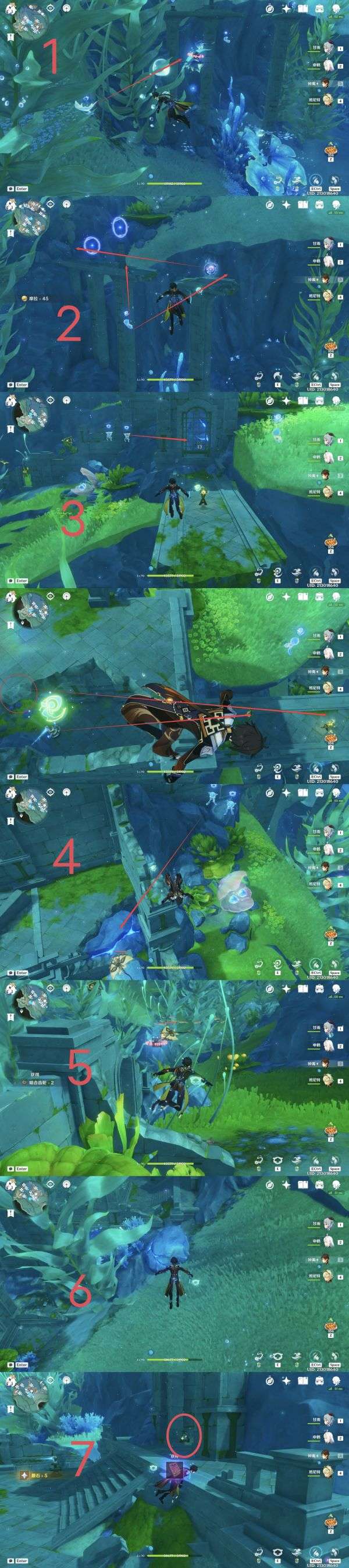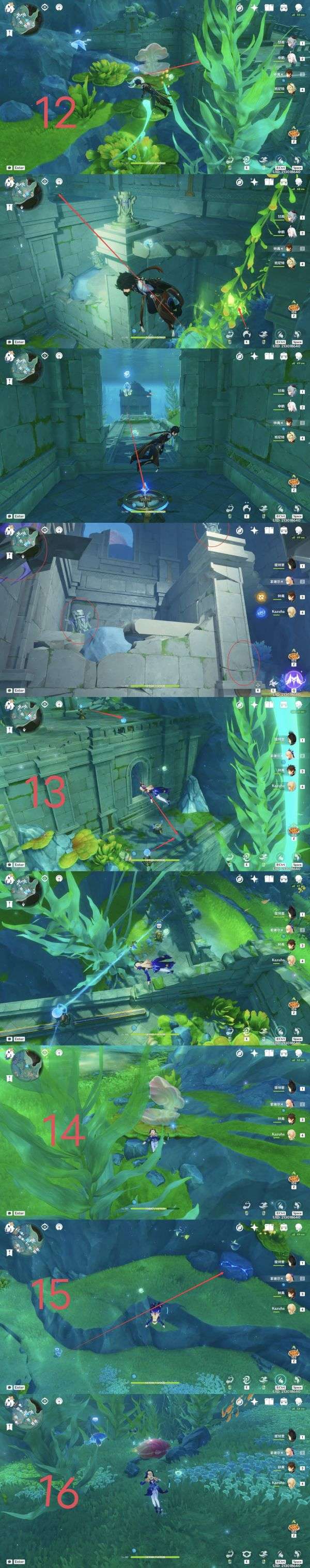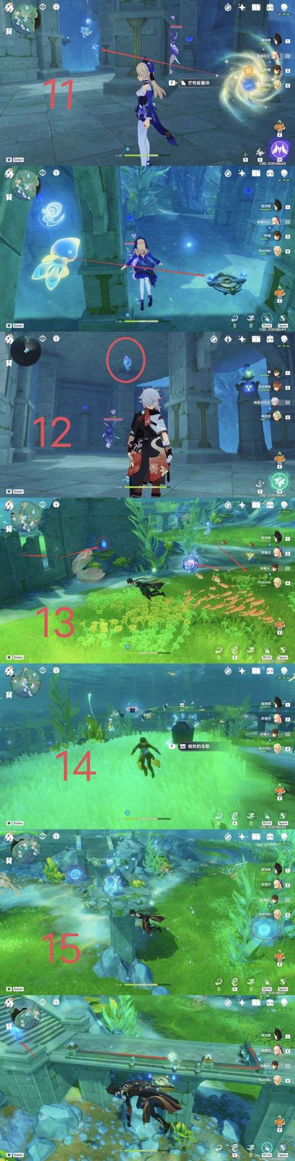 12.精致宝箱,获取猎刀鳐的能力,进入房间消除藤蔓将晶块安置在调节阀上,球球章鱼的能力长按对着调节阀降水位,快速从下往上激活四个雷元素方碑即可获得宝箱;